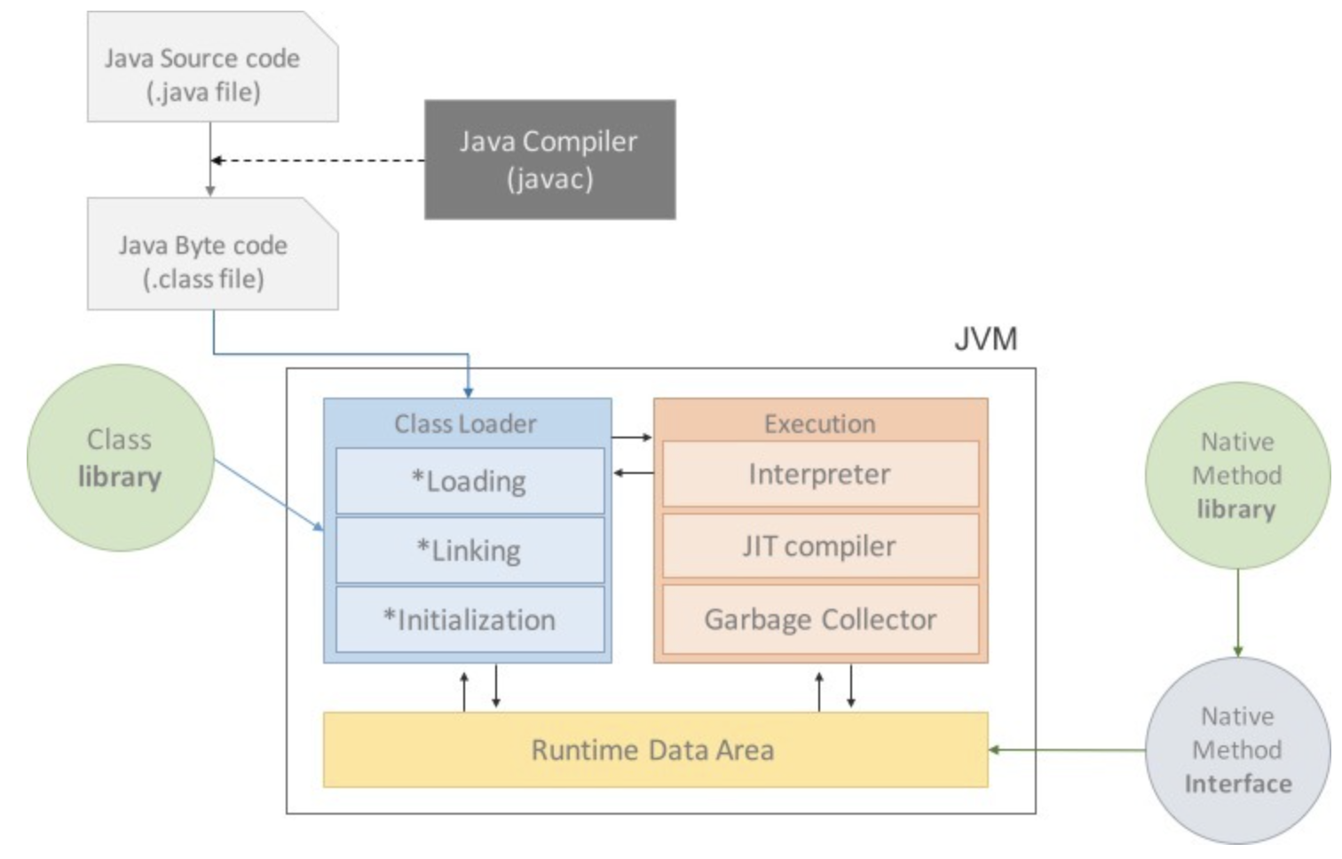 1) 개요 자바가 플랫폼에 종속되지 않을 수 있는 이유는 자바 바이트코드가 JRE(Java Runtime Environment) 위에서 동작하는 방식 때문이다. JRE의 핵심 구성요소는 자바 바이트코드를 해석하고 실행하