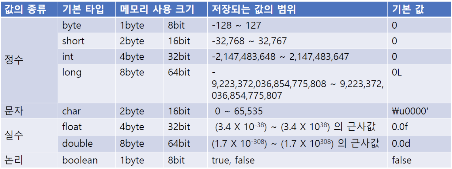 - 프리미티브 타입 종류와 값의 범위 그리고 기본 값