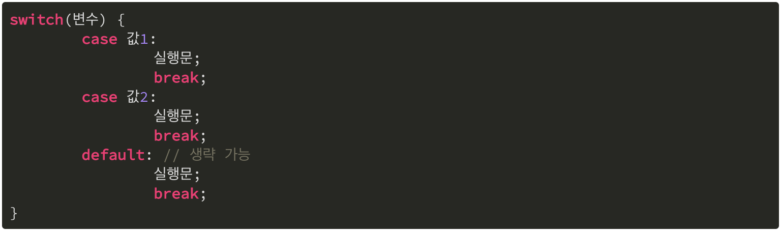 - 변수 값에 따라 case가 실행된 후 제어문을 빠져나가기 위해 break를 사용한다.