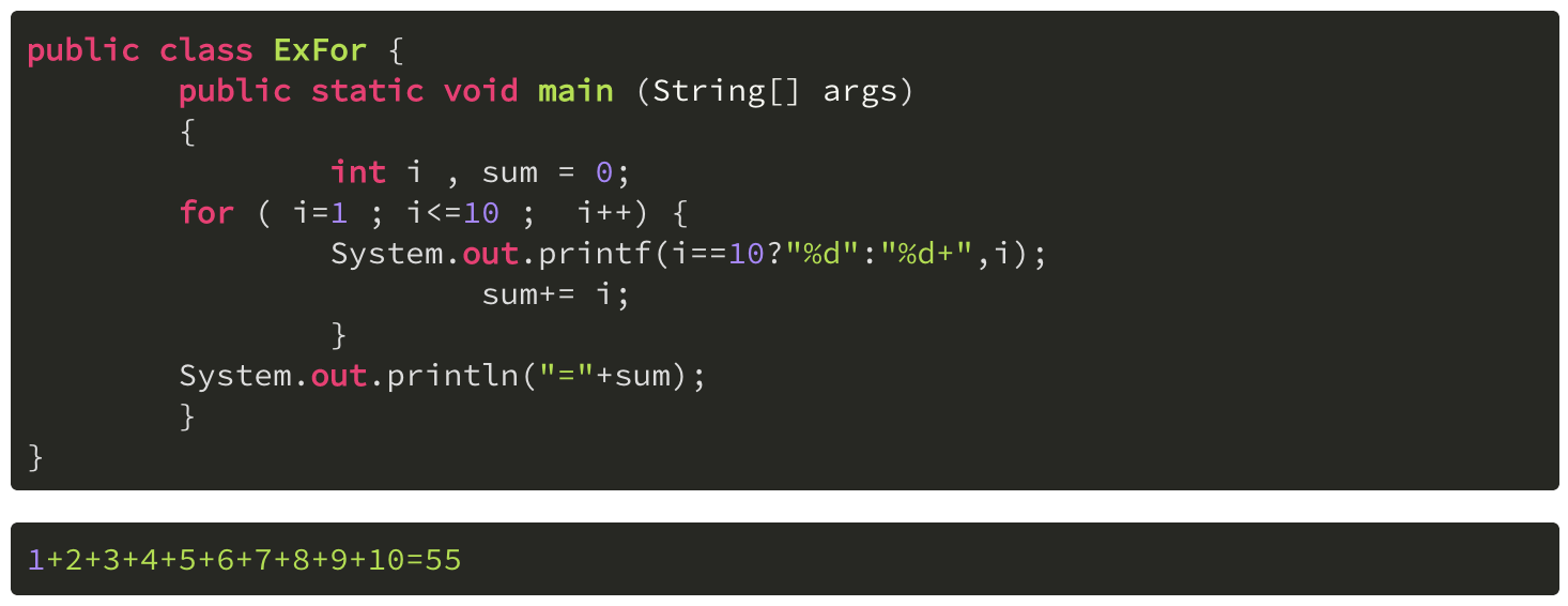 - 선언형식: for(초기식; 조건식; 증감식) { 실행할 명령 }